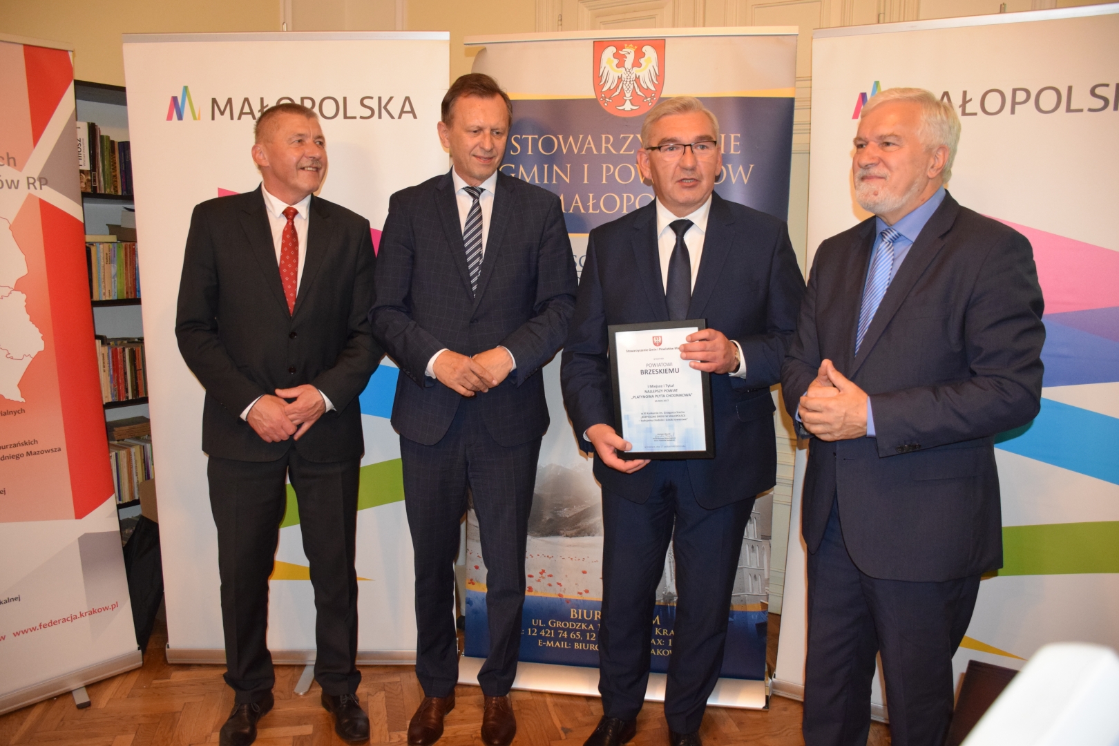 Powiat Brzeski po raz kolejny znalazł się w czołówce powiatów Małopolskich. Wczoraj Starosta Brzeski Andrzej Potępa oraz Przewodniczący Rady Kazimierz Brzyk odebrali pierwszą nagrodę z rąk Kazimierza Barczyka - prezesa Stowarzyszenie Gmin i Powiatów Małopolski. Powiat Brzeski okazał się liderem w corocznym rankingu "Bezpieczne Drogi w Małopolsce”. Podsumowanie dotyczyło roku 2017, więc nie będzie zaskoczeniem, gdy Powiat wygra również w następnej edycji Konkursu. W roku 2018 wybudowano dwa razy więcej nowych chodników. Ponadto na następne lata są już przygotowane kolejne projekty, które mają prawomocne pozwolenia na budowę.