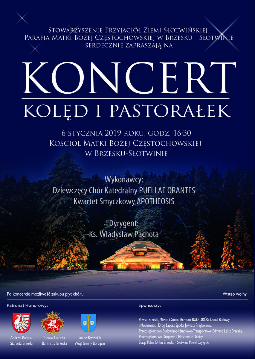 Stowarzyszenie Przyjaciół Ziemi Słotwińskiej oraz Parafia Matki Bożej Częstochowskiej w Brzesku-Słotwinie Serdecznie Zapraszają na Koncert Kolęd i Pastorałek w wykonaniu jednego z najlepszych młodzieżowych chórów europejskich - Dziewczęcego Chóru Katedralnego "Puellae Orantes" z Tarnowa, przy akompaniamencie Kwartetu Smyczkowego "Apotheosis" z Katowic. To niezwykłe wydarzenie doskonale wpisuje się w radosne świętowanie czasu Bożego Narodzenia i uatrakcyjnia ofertę kulturalną kierowaną do mieszkańców miasta Brzeska i regionu. Koncert odbędzie się w niedzielę, 6 stycznia 2019 roku w kościele Matki Bożej Częstochowskiej w Brzesku – Słotwinie o godz. 16:30