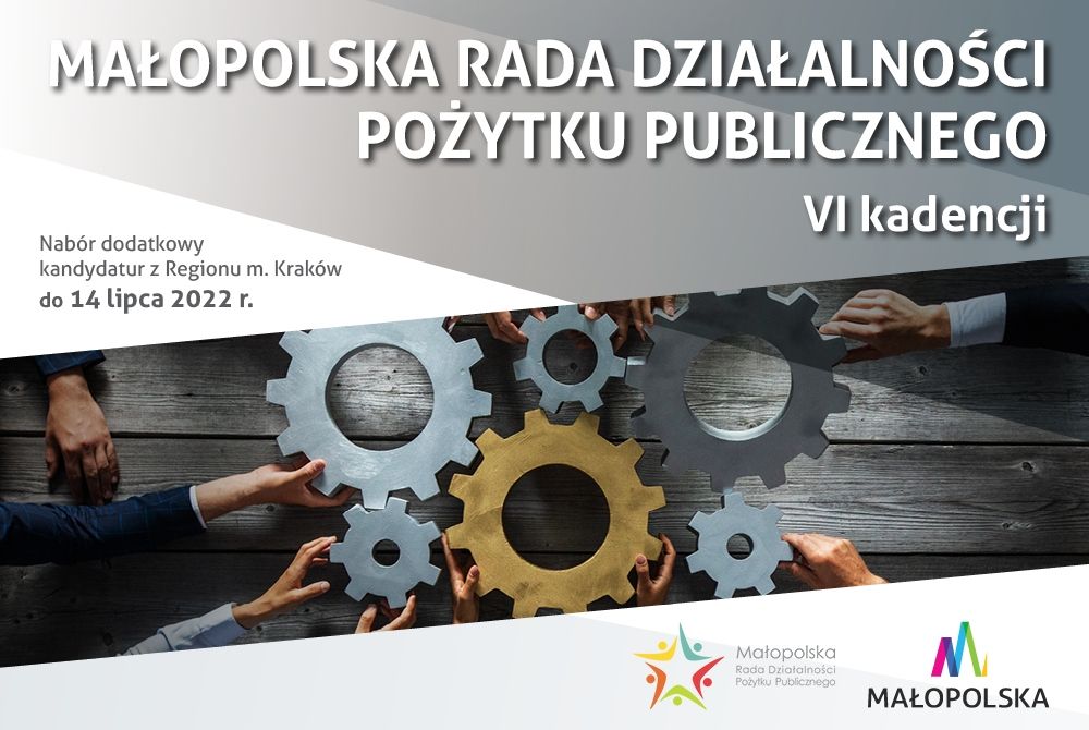 Na podstawie § 5 ust. 4 Regulaminu określającego tryb powoływania członków Małopolskiej Rady Działalności Pożytku Publicznego, termin i sposób zgłaszania kandydatów, przyjętego uchwałą Nr 874/22 Zarządu Województwa Małopolskiego w dniu 31 maja 2022 r. w sprawie trybu powołania członków Małopolskiej Rady Działalności Pożytku Publicznego, terminu i sposobu zgłaszania kandydatów oraz określenia organizacji i trybu jej działania, ogłasza: dodatkowy nabór kandydatów z Regionu miasto Kraków do Małopolskiej Rady Działalności Pożytku Publicznego.