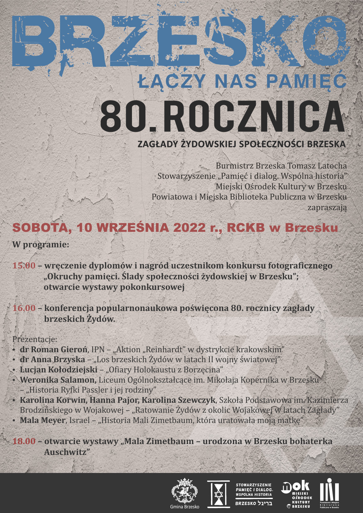 Urząd Miasta Brzeska, Stowarzyszenie „Pamięć i dialog. Wspólna historia”, Miejski Ośrodek Kultury w Brzesku; Powiatowa i Miejska Biblioteka Publiczna w Brzesku zapraszają na uroczystości 80. rocznicy zagłady żydowskiej społeczności Brzeska. W ich ramach zaplanowano szereg wydarzeń w dniach 10-11 września 2022 r.