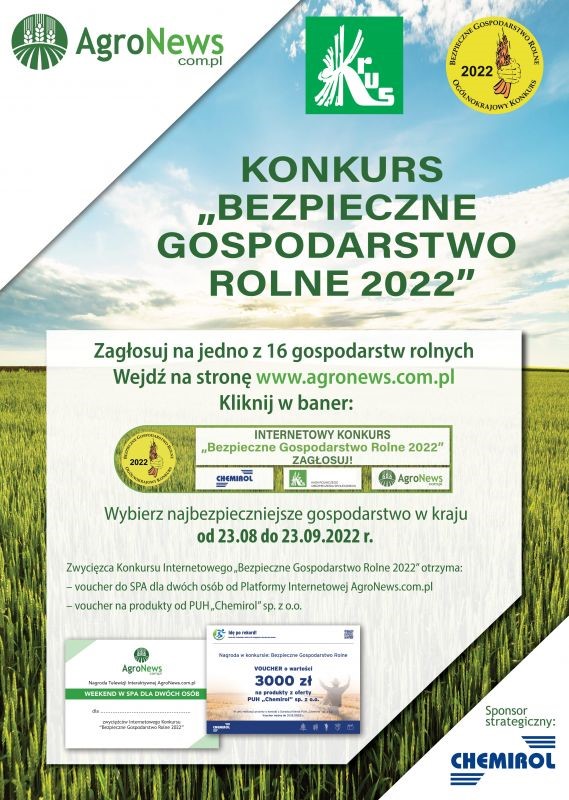 Kasa Rolniczego Ubezpieczenia Społecznego zaprasza do oddania głosu w internetowym konkursie na "Bezpieczne Gospodarstwo Rolne 2022". Swój głos można oddać na stronie www.agronews.com.pl.