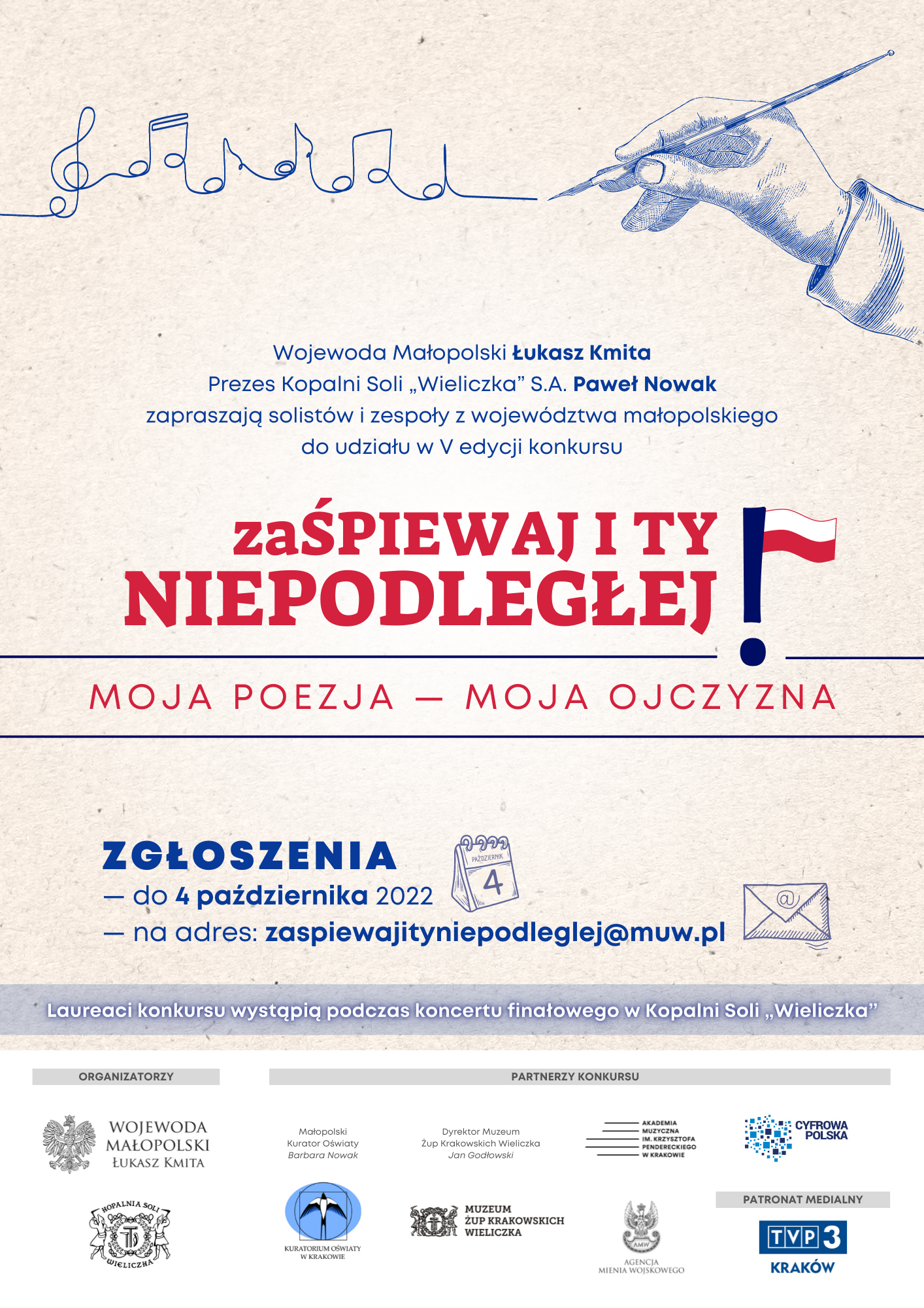 Wojewoda Małopolski Łukasz Kmita wraz z Prezesem Zarządu Kopalni Soli „Wieliczka” S.A Pawłem Nowakiem, Prezesem Zarządu Kopalni Soli „Wieliczka” Turystyka Sp. z o.o. Michałem Roehlichem, Małopolskim Kuratorem Oświaty Barbarą Nowak oraz Dyrektorem Muzeum Żup Krakowskich Wieliczka Janem Godłowskim serdecznie zapraszają uczniów szkół podstawowych z województwa małopolskiego do udziału w konkursie „zaŚPIEWAJ I TY NIEPODLEGŁEJ! V edycja organizowanego pod hasłem „Moja Poezja – Moja Ojczyzna”