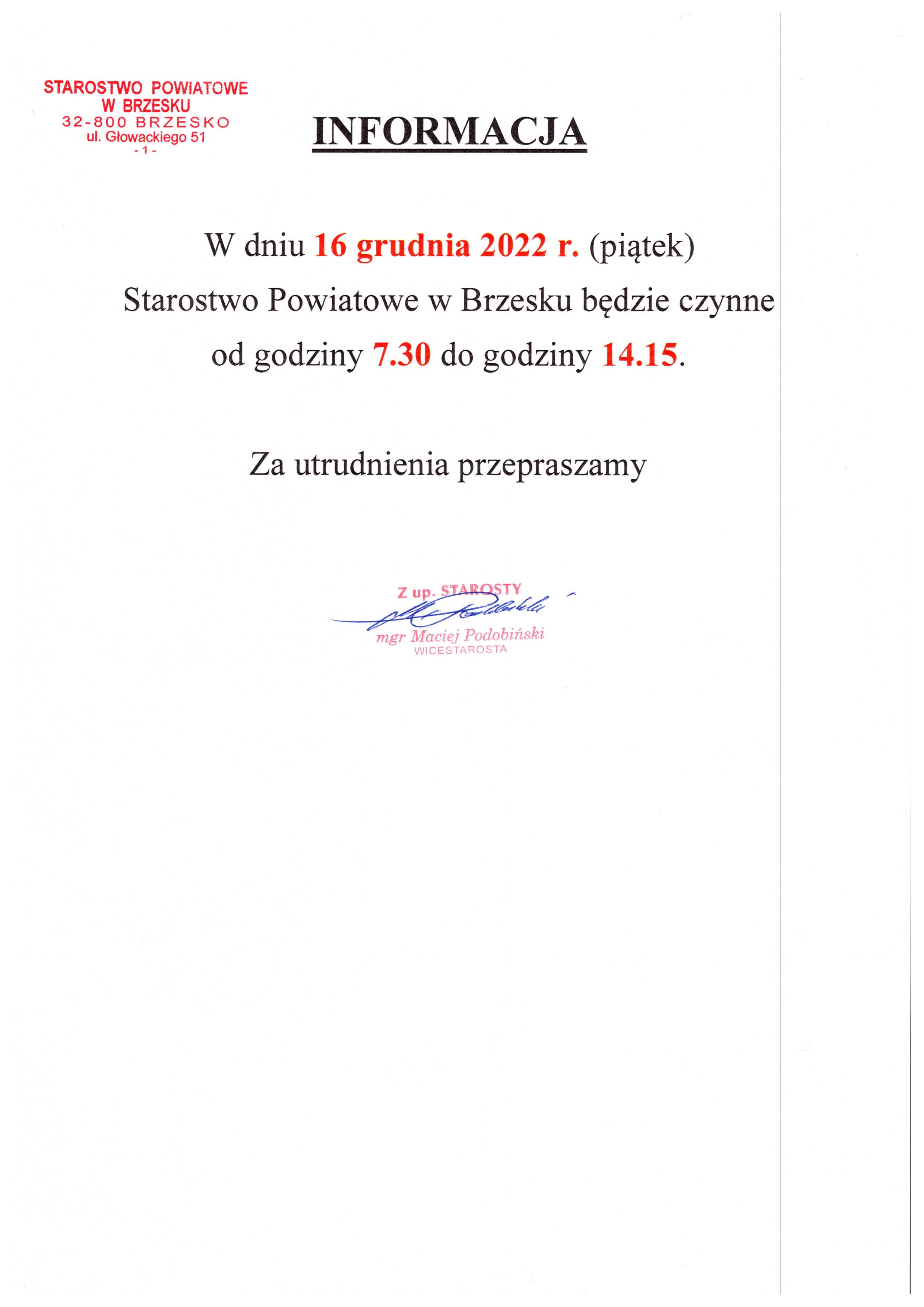 W dniu 16 grudnia 2022 r. (piątek) Starostwo Powiatowe w Brzesku będzie czynne od godziny 7.30 do godziny 14.15.