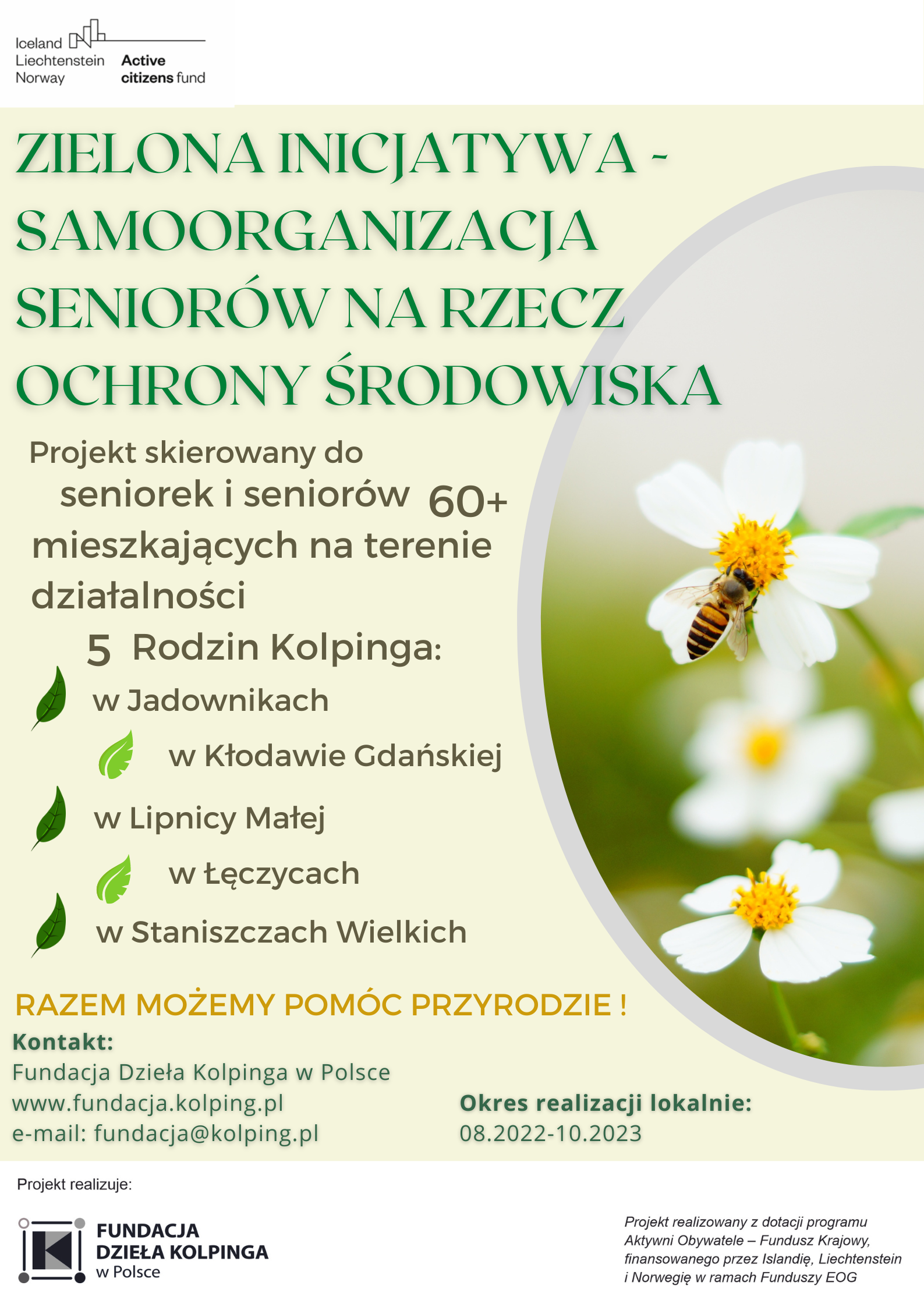 Na terenie Jadownik realizowany jest projekt „Zielona inicjatywa – samoorganizacja seniorów na rzecz ochrony środowiska” z dotacji programu „Aktywni Obywatele – Fundusz Krajowy” finansowany przez Islandię, Liechtenstein i Norwegię w ramach Funduszy EOG. Jest on skierowany do osób w wieku 60+ chcących zwiększyć swoją aktywność obywatelską, pogłębić wiedzę z zakresu ochrony środowiska oraz namacalnie przyczynić się do zmian na lepsze w swoim najbliższym otoczeniu. Projekt jest realizowany przez Fundacje Dzieła Kolpinga w Polsce wraz z Rodziną Kolpinga z Jadownik. Fundacja Dzieła Kolpinga kolejny raz chce zwrócić uwagę na istotę działań lokalnych, które mogą przyczynić się do zmian na poziomie światowym.