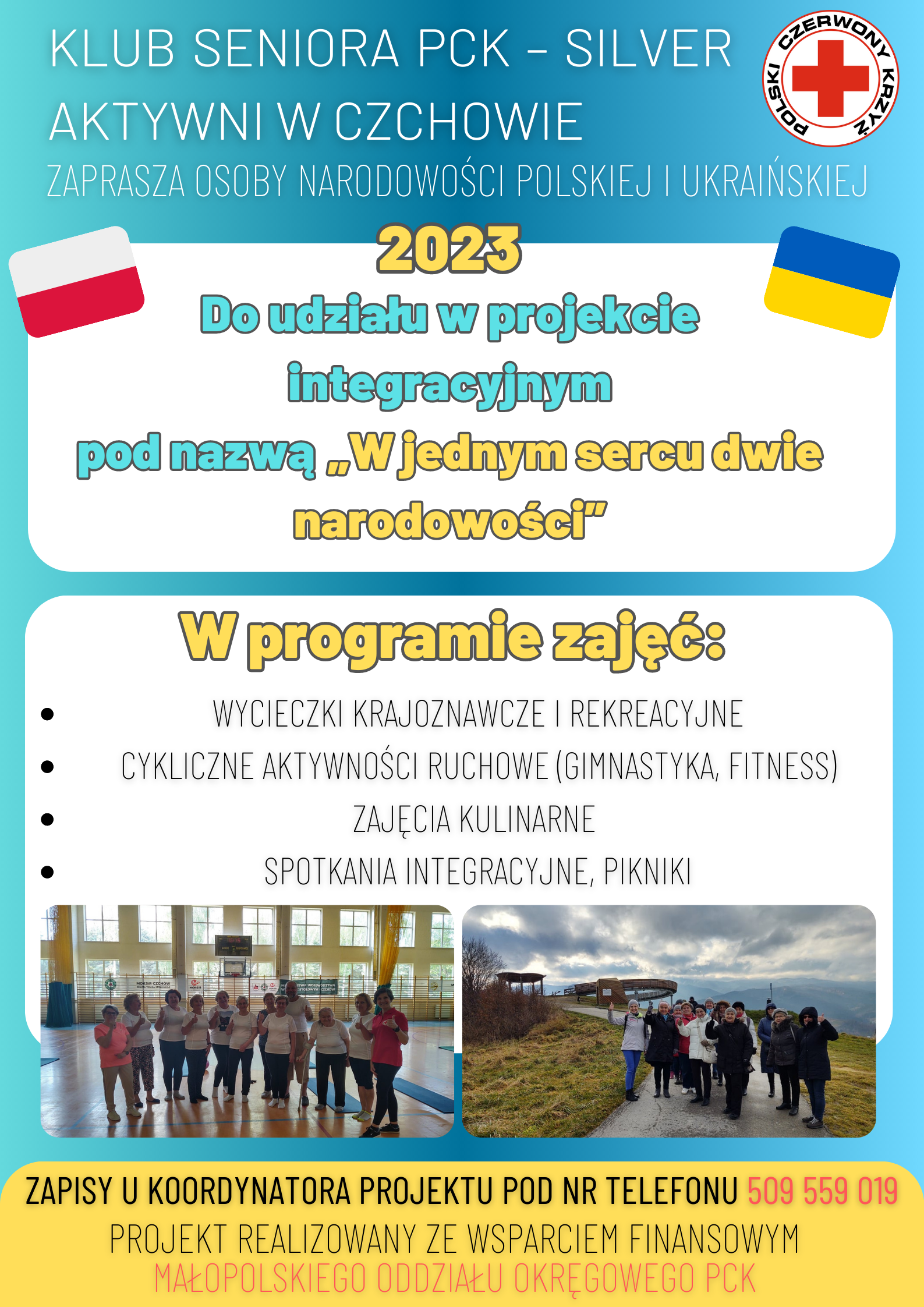 Małopolski Oddział Okręgowy Polskiego Czerwonego Krzyża ogłasza nabór do projektu pod nazwą „W jednym sercu dwie narodowości”. Projekt ma na celu integrację obywateli ukraińskich i polskich i skierowany jest do osób 50+. Beneficjentami mogą zostać osoby zamieszkujące na terenie powiatu brzeskiego. W ramach zajęć przewidziano wycieczki kulturoznawcze, wydarzenia kulturalne, zajęcia rekreacyjne. Realizacja projektu potrwa do końca roku kalendarzowego. Osoby zainteresowane proszone są o zgłaszanie się do koordynatora (tel. 509 559 019).