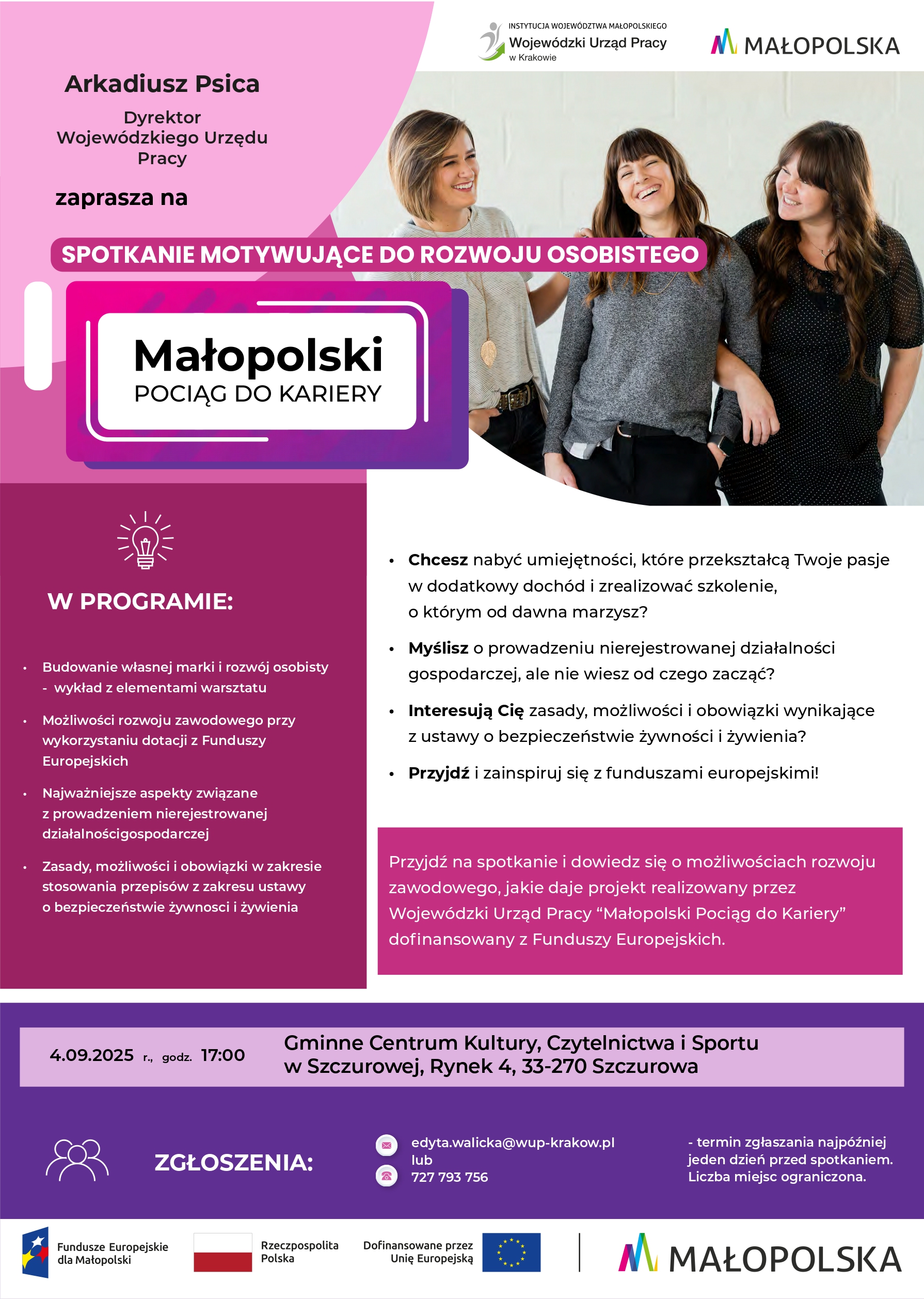 Wojewódzki Urząd Pracy w Krakowie, realizując projekt „Małopolski pociąg do kariery – sezon 1” organizuje cykl spotkań świadomościowych dedykowanych pracującym Małopolanom, w tym szczególnie kobietom posiadającym maksymalnie średnie wykształcenie, osobom po 50. roku życia i osobom z niepełnosprawnościami.