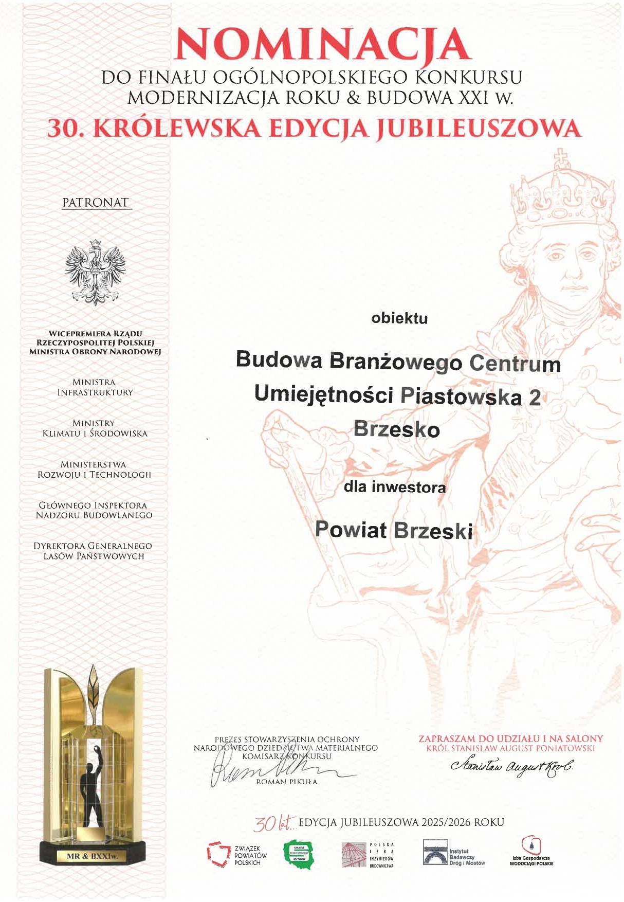 Do finału zakwalifikowała się inwestycja „Budowa Branżowego Centrum Umiejętności w Brzesku”, której inwestorem jest Powiat Brzeski. Projekt pomyślnie przeszedł procedury konkursowe i został zakwalifikowany do finału ogólnopolskiego konkursu.